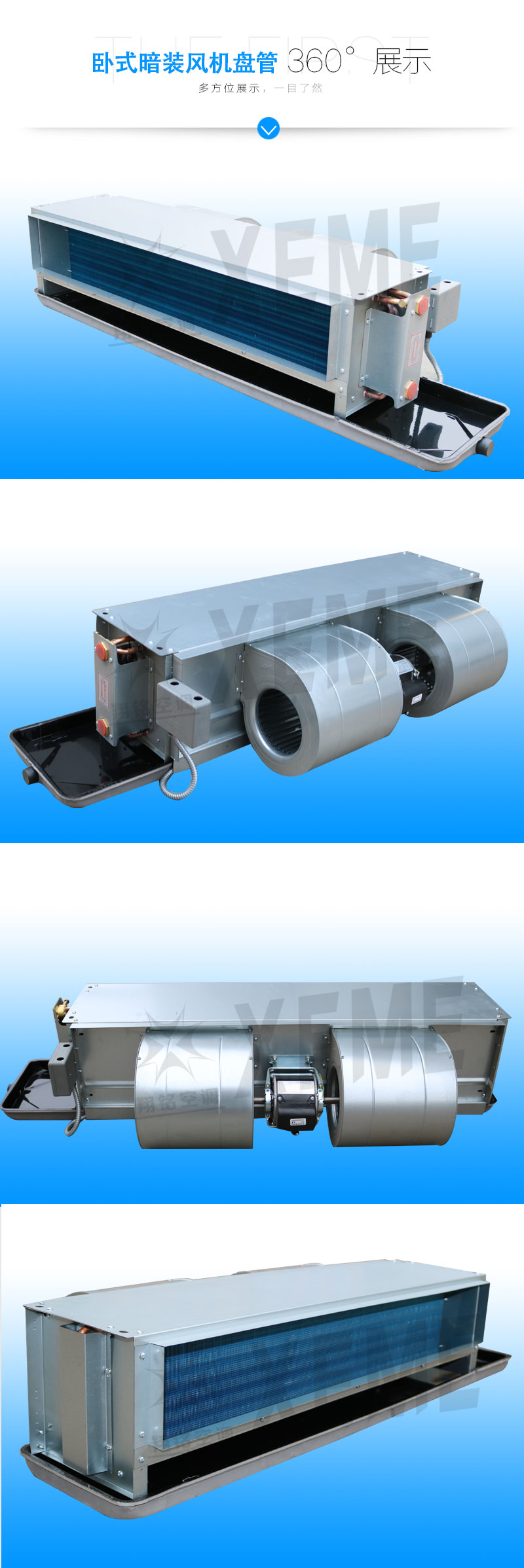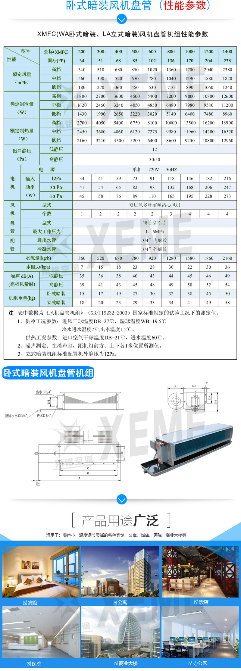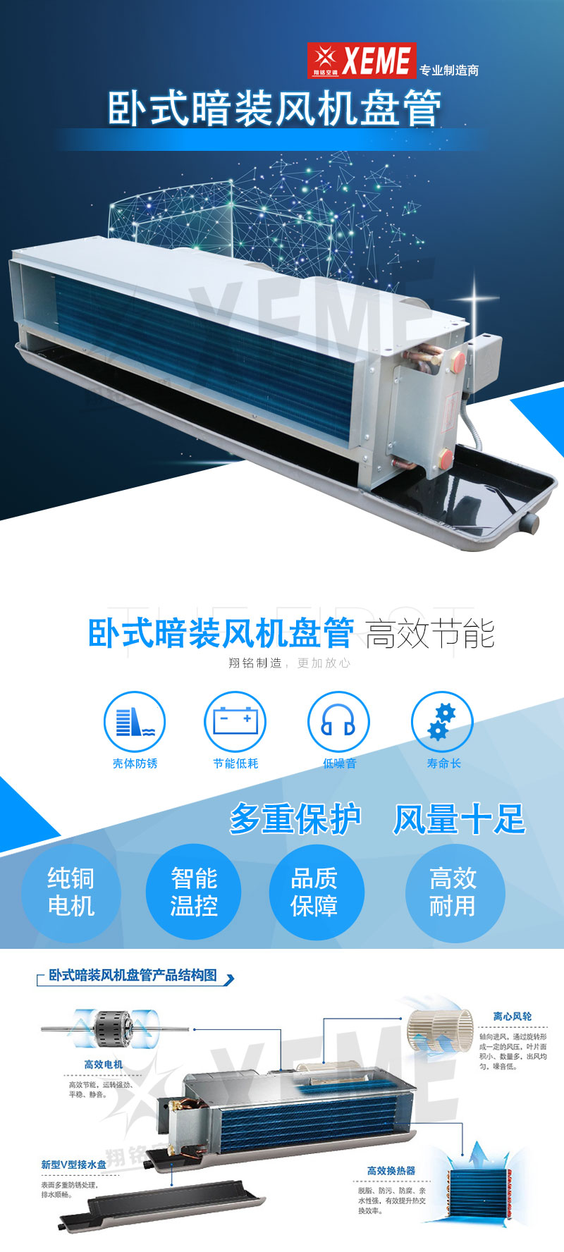 江蘇翔銘空調(diào)設(shè)備有限公司——臥式暗裝風(fēng)機(jī)盤管機(jī)組選用主要控制參數(shù)額定風(fēng)量、出口靜壓、輸入功率、額定供冷量、額定供熱量、噪聲、水阻等。對于雙管制水系統(tǒng)(適用于只按季節(jié)或只按空調(diào)區(qū)域進(jìn)行供熱或供冷轉(zhuǎn)換的空調(diào)系統(tǒng))的風(fēng)機(jī)盤管機(jī)組,只配置一組盤管,冬夏供熱/ 供冷兼用機(jī)型。對于四管制水系統(tǒng)(適用于供熱/ 供冷頻繁轉(zhuǎn)換的空調(diào)系統(tǒng)) 的風(fēng)機(jī)盤管機(jī)組,應(yīng)配置加熱和冷卻兩組盤管的組合式機(jī)型。